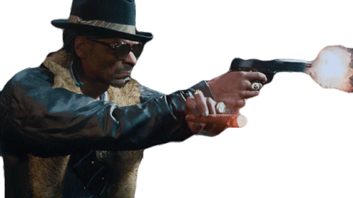 Snoop Dogg, in his Call of Duty avatar, aims and fires a pistol, depicted with muzzle flash and smoke.