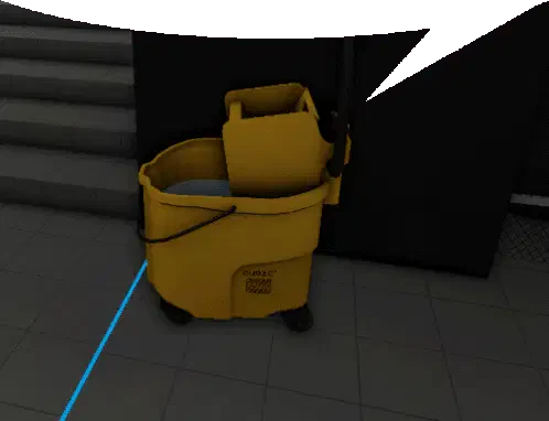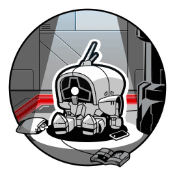 A cute Gundam Evolution Gevo robot sits in a futuristic room, surrounded by a mouse, phone, and book, taking a break.