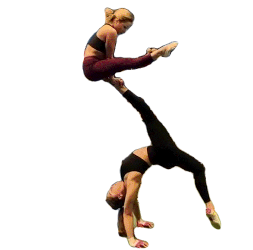 Two women perform an impressive acrobatic gymnastics stunt, with one balancing the other in a flexible pose.