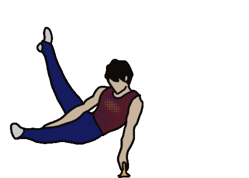 An illustrated male gymnast, Kohei, performs a complex pommel horse skill, showcasing strength and balance.