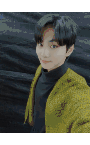 a young man wearing a black turtleneck and a green cardigan looks at the camera