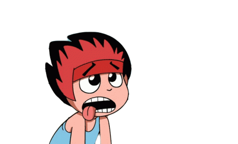 A cartoon character with a red headband looks utterly exhausted and thirsty, tongue hanging out, from intense heat.