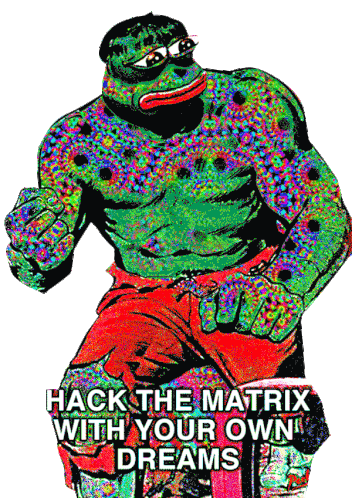 An animated sticker featuring a sad Pepe the Frog, hacking the matrix with its own dreams. A digital art piece.