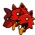 Three red, cartoon Cerberus heads from Hades with green eyes and long tongues, subtly animated.
