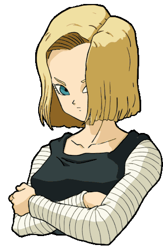 Android 18, the iconic Dragon Ball Z character, playfully flips her blonde hair with a flirty look.