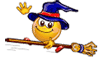 A cheerful smiley face wearing a witch hat soars through the air on a magic broom, celebrating Halloween.
