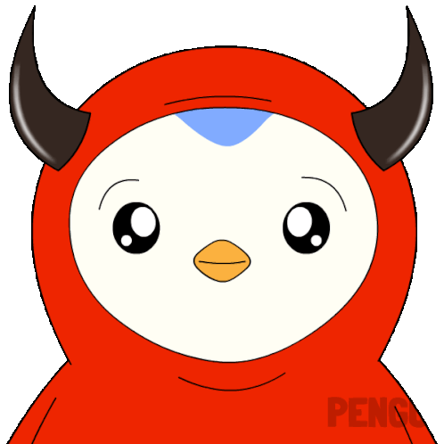 a penguin with horns is holding a knife in its mouth and the word pengo is below it