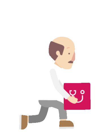 A cartoon man experiences sudden back pain, dropping a medical service icon. Represents seeking help for lumbago.