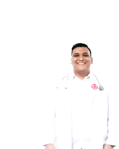 a doctor with a stethoscope pointing up with the words swipe up behind him