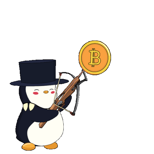 a penguin in a top hat is holding a crossbow and a balloon with a bitcoin symbol on it