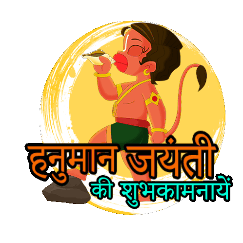 Animated sticker wishing 'Happy Hanuman Jayanti' with a cartoon young Hanuman blowing a conch shell.
