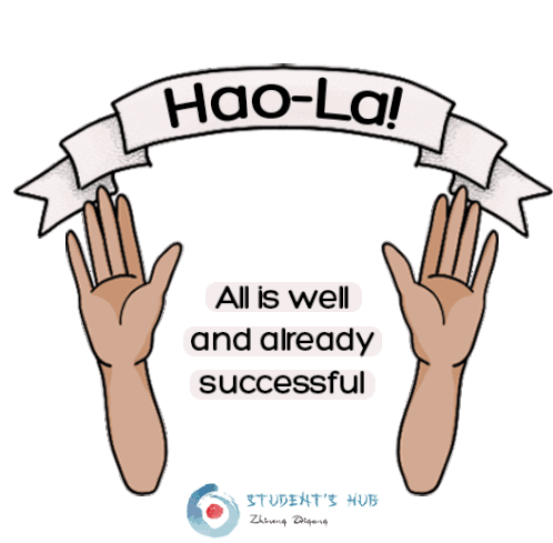 Animated sticker featuring hands holding a banner with 'Hao-La!' and the message 'All is well and already successful,' conveying good wishes.