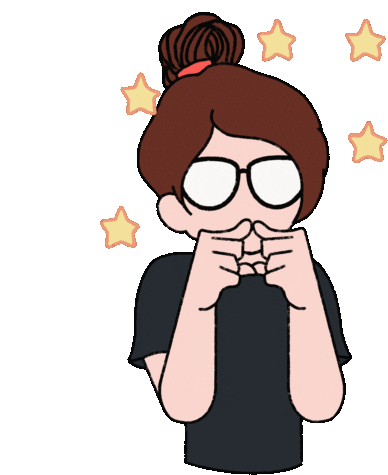 Animated sticker of Vera Sans, a cute anime girl with glasses and a bun, sparkling with happiness and stars.