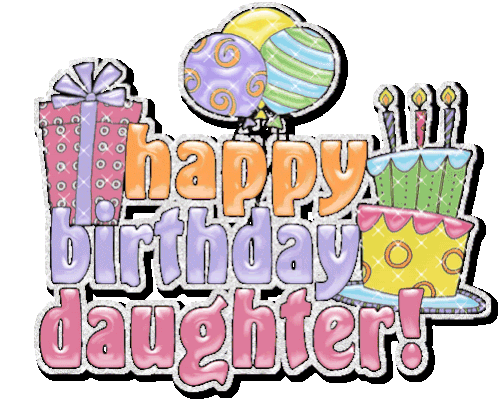 A vibrant animated greeting for a daughter's birthday, featuring 'Happy Birthday Daughter' text, colorful balloons, confetti, and gifts.