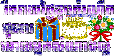 A glittery animated sticker wishing 'Happy Birthday' in both English and Khmer, featuring gifts and cake.