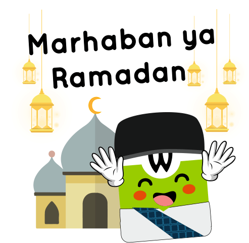 Animated sticker featuring a cheerful character in a peci, mosque, and lanterns, with 'Marhaban ya Ramadan' greeting.