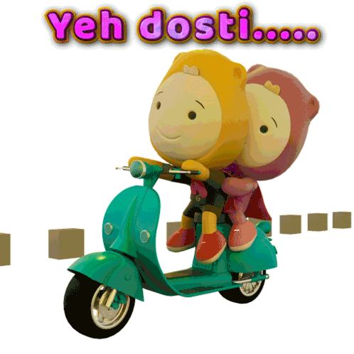 a couple of stuffed animals riding a scooter with the words yeh dosti written above them