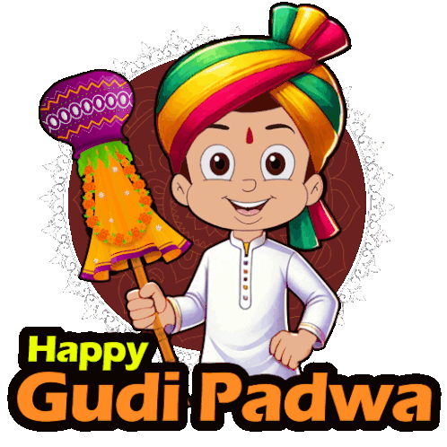 Chhota Bheem celebrates Happy Gudi Padwa, holding a traditional Gudi. A vibrant sticker for the Hindu New Year.