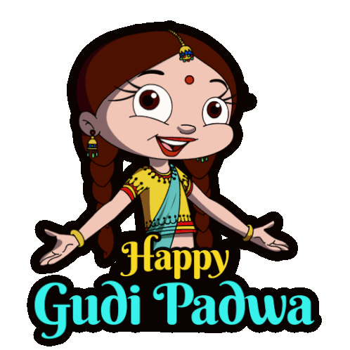 Chutki from Chhota Bheem celebrates Happy Gudi Padwa, the Hindu New Year, with outstretched arms and a joyful smile.
