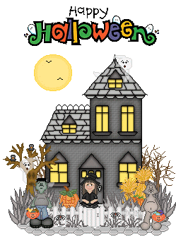 A festive Happy Halloween sticker featuring a haunted house with glowing green eyes appearing in its windows, surrounded by trick-or-treaters.