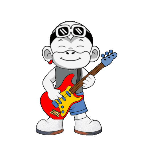 a cartoon character holding a red guitar that says zhot on it
