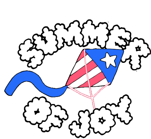 A vibrant kite with a Puerto Rican flag design flies amidst cloud-like 'SUMMER OF JOY' text, celebrating summer.