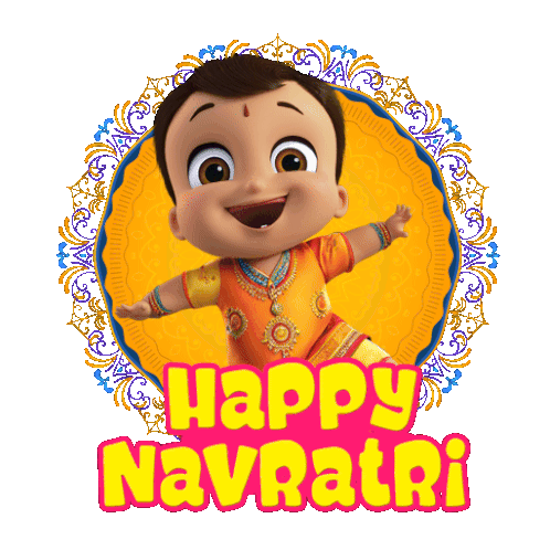 Chhota Bheem celebrates Happy Navratri with a joyful smile, dressed in traditional attire against a vibrant mandala background.