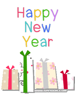 A colorful gift box opens to reveal "Happy New Year" in both Thai and English, surrounded by festive confetti.