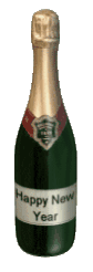 A pixelated champagne bottle with a "Happy New Year" label, spinning to celebrate the new year.