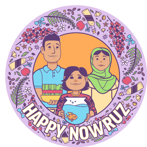 A family celebrates Nowruz with traditional Haft-Seen items, including a child holding a goldfish.