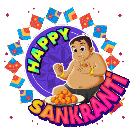 Kalia from Chhota Bheem celebrates Happy Sankranti, joyfully eating traditional sweets (ladoos) amidst festive kites.