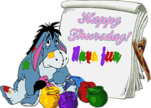 Pants Bear, a cute cartoon character, wishes a Happy Thursday surrounded by hearts. Also featuring Eeyore.