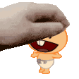 a cartoon baby in a diaper is laughing while being held by a hand .