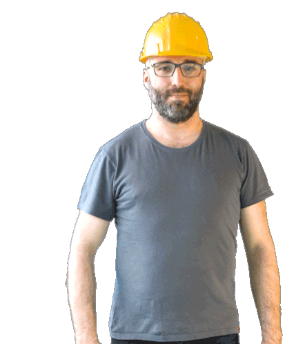 Josef Beneš, wearing a hard hat and glasses, gives a cheerful thumbs up, signaling approval and happiness.