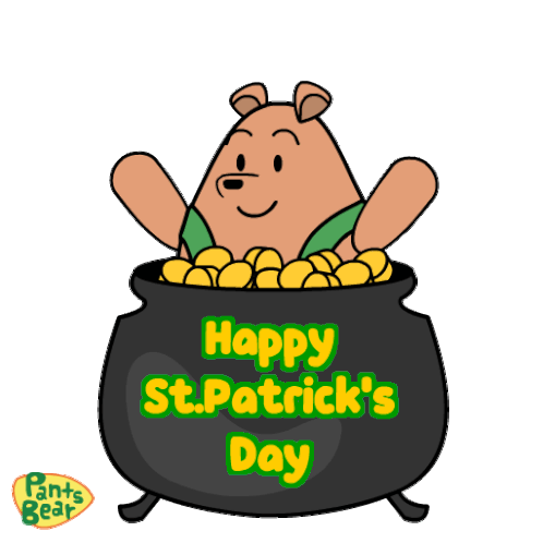 Pants Bear celebrates St. Patrick's Day, sitting in a pot of gold and juggling coins with a happy smile.