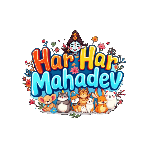 a logo for har har mahadev with animals and flowers surrounding it
