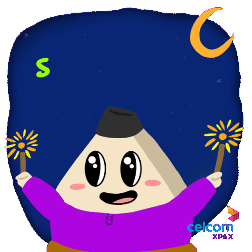 A cheerful ketupat character in a songkok and Baju Melayu celebrates Hari Raya with sparklers and fireworks.