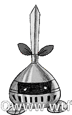 Harold Omori's unique character sticker featuring a knight's helmet with a sword and leaves, expressing 'Owww wtf'.