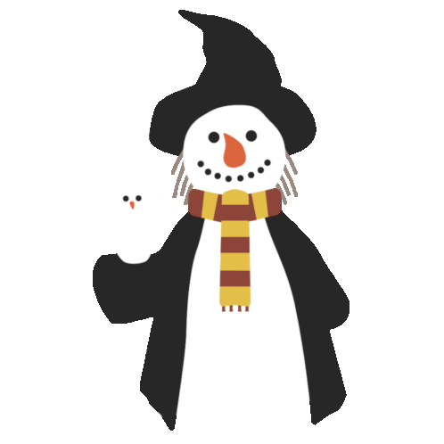 An animated sticker featuring a Harry Potter-themed snowman with a wizard hat and scarf, holding a small owl.