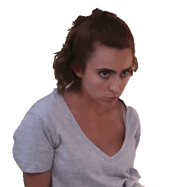 A woman with a ponytail and grey v-neck t-shirt looks intently with a concerned expression, reflecting a 'fed up' mood.