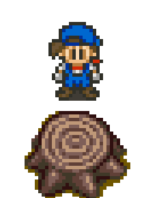 A pixel art farmer from Harvest Moon SNES chops a tree stump, creating sparks in this retro game animation.