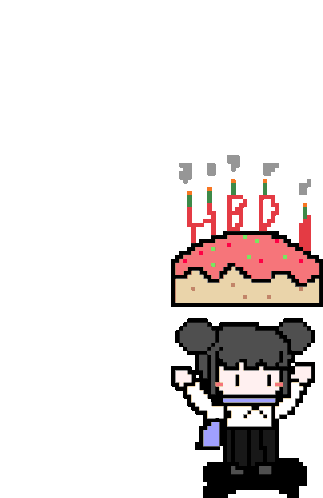 Hbdmei celebrates a happy birthday with a pixel art cake and flickering candles, raising arms in joy.