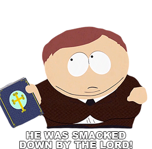 Eric Cartman from South Park is dramatically smacked down by the Lord, falling forward with a Bible.