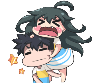 An animated chibi girl with dark hair playfully squeezes the cheeks of a boy riding on his back, showing exaggerated emotion.
