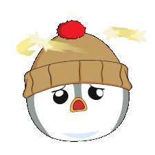 A cute pudgy penguin character with a brown beanie and red pom-pom looks dazed and confused with stars circling its head, indicating a headache or feeling stunned.