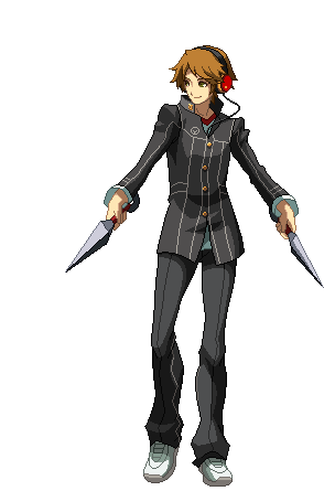 Yosuke Hanamura from Persona 4 posing with red headphones around his neck, wearing a school uniform.