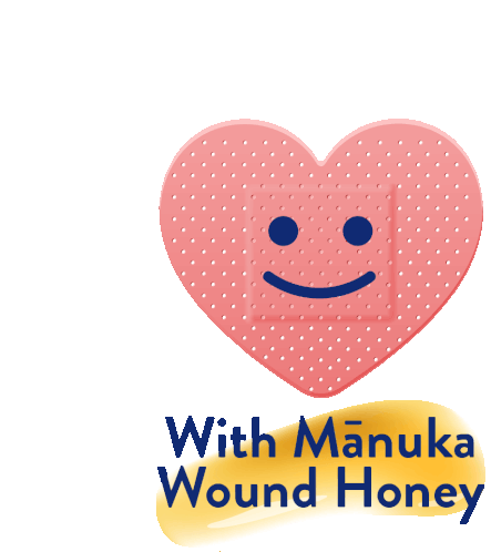 A caring heart-shaped bandage with a smiley face, featuring Mānuka Wound Honey for natural healing and wellness.