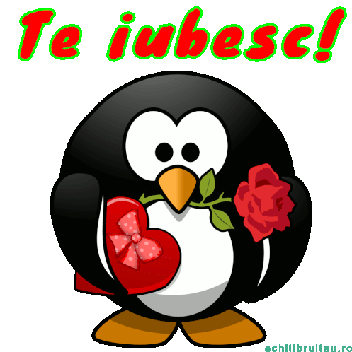 Cute penguin holding a heart box and a rose, expressing 'I love you' and 'I miss you'.