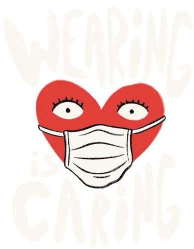 A red heart with eyes and eyelashes blinks while wearing a white face mask, with the message "Wearing Is Caring" by Jef Caine.