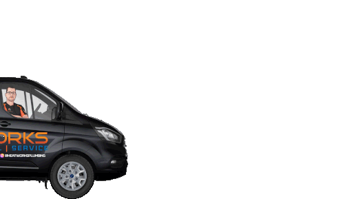 Heatworks Plumbing van sticker showcasing central heating, boiler installation, and plumbing solutions in Surrey & Sussex.